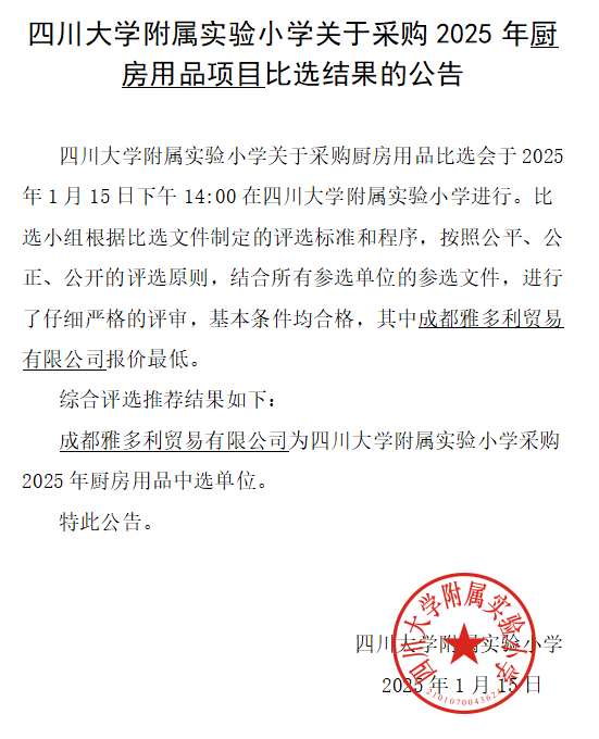 四川大学附属实验小学关于采购2025年厨房用品项目比选结果的公告