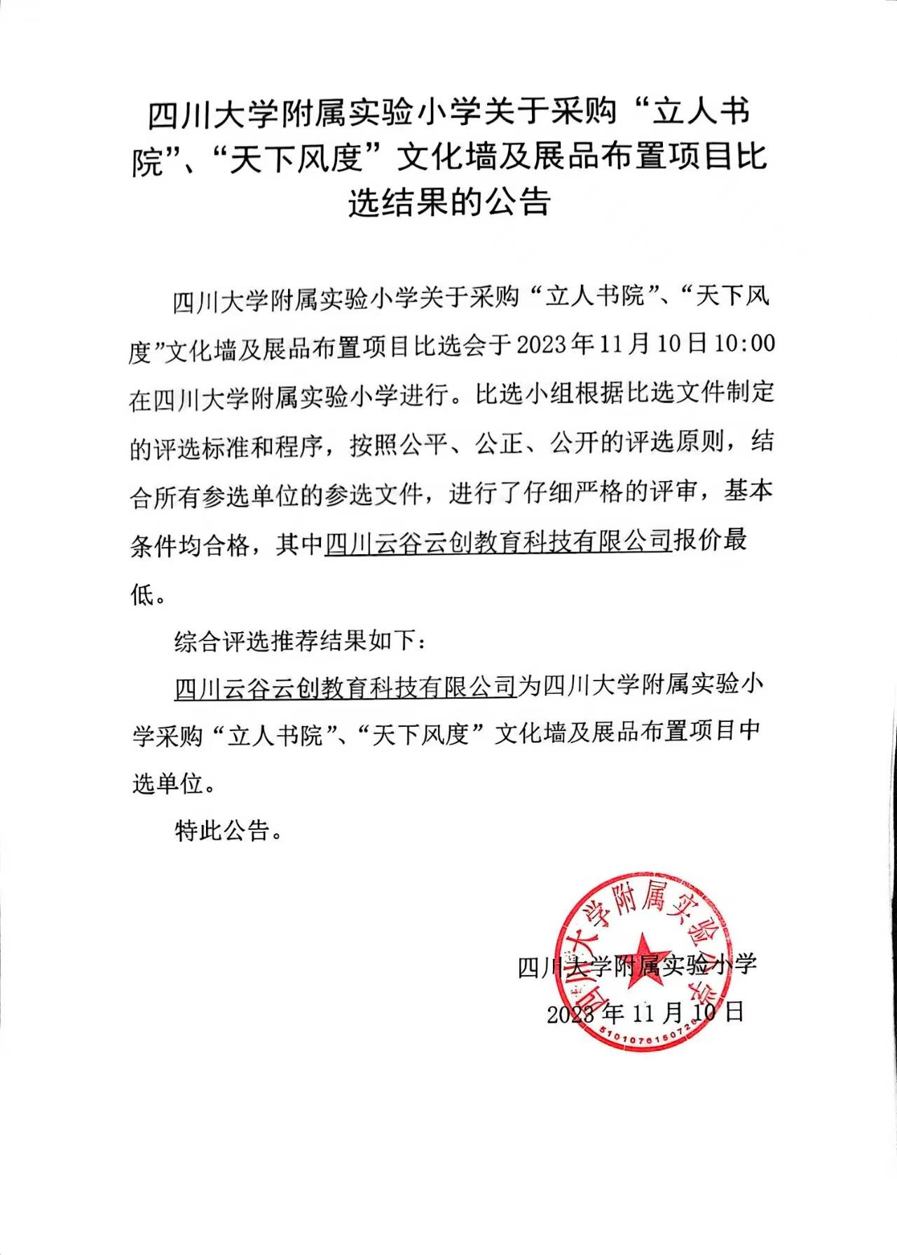 下一条:四川大学附属实验小学采购“立人书院”、“天下风度”文化墙及展品布置项目比选通知书