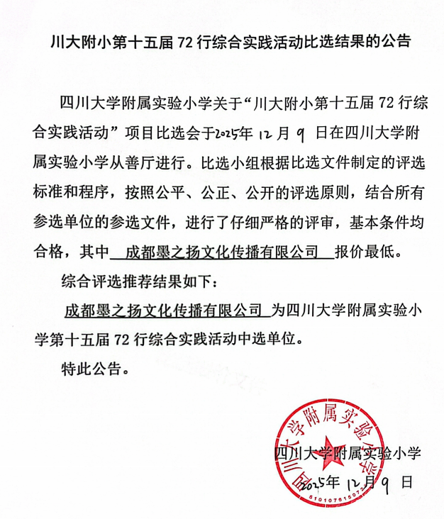 下一条:四川大学附属实验小学第十五届72行综合实践活动比选通知书