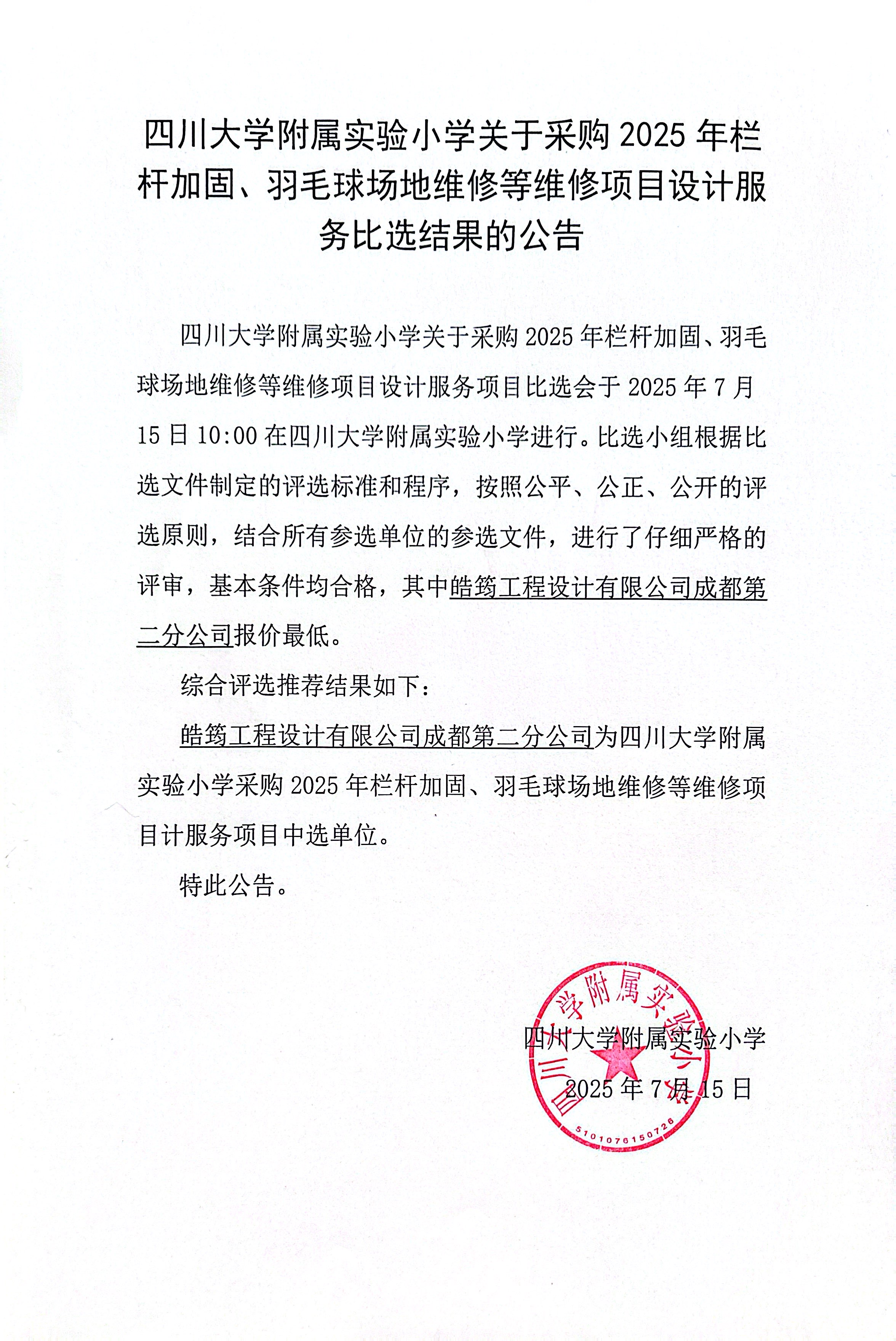 下一条:四川大学附属实验小学2025年栏杆加固、羽毛球场地维修等维修项目设计服务比选通知书