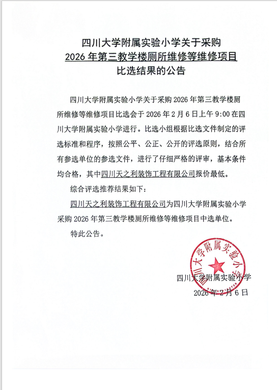 上一条:四川大学附属实验小学关于采购 2026年厨房用品项目 比选结果的公告